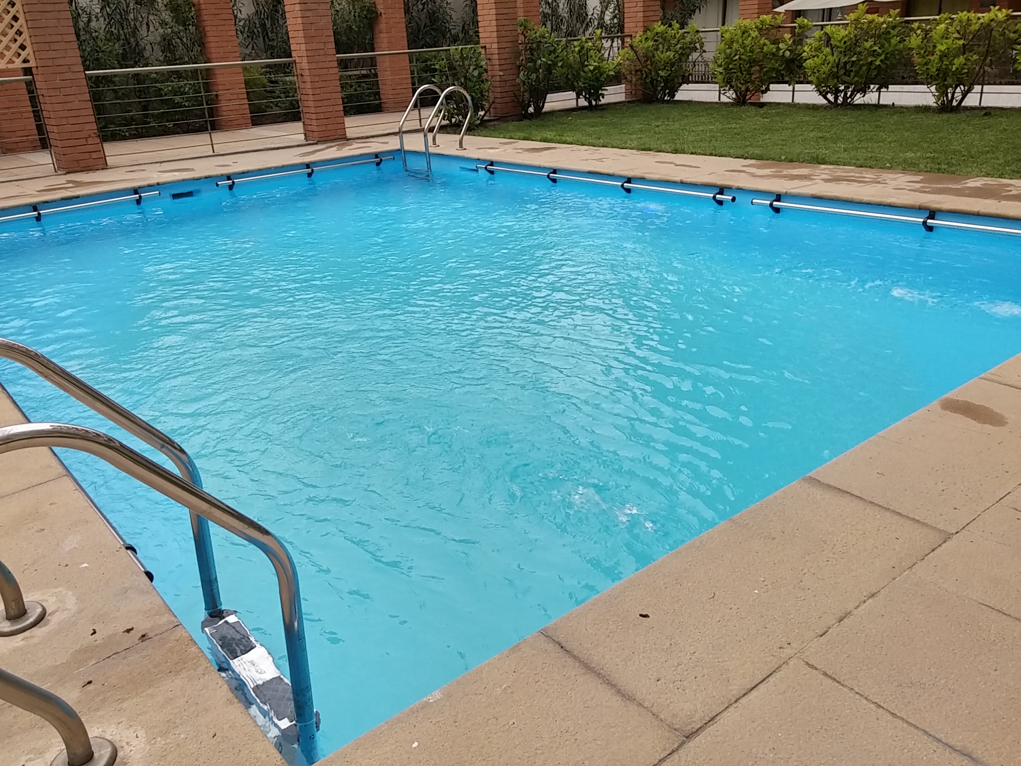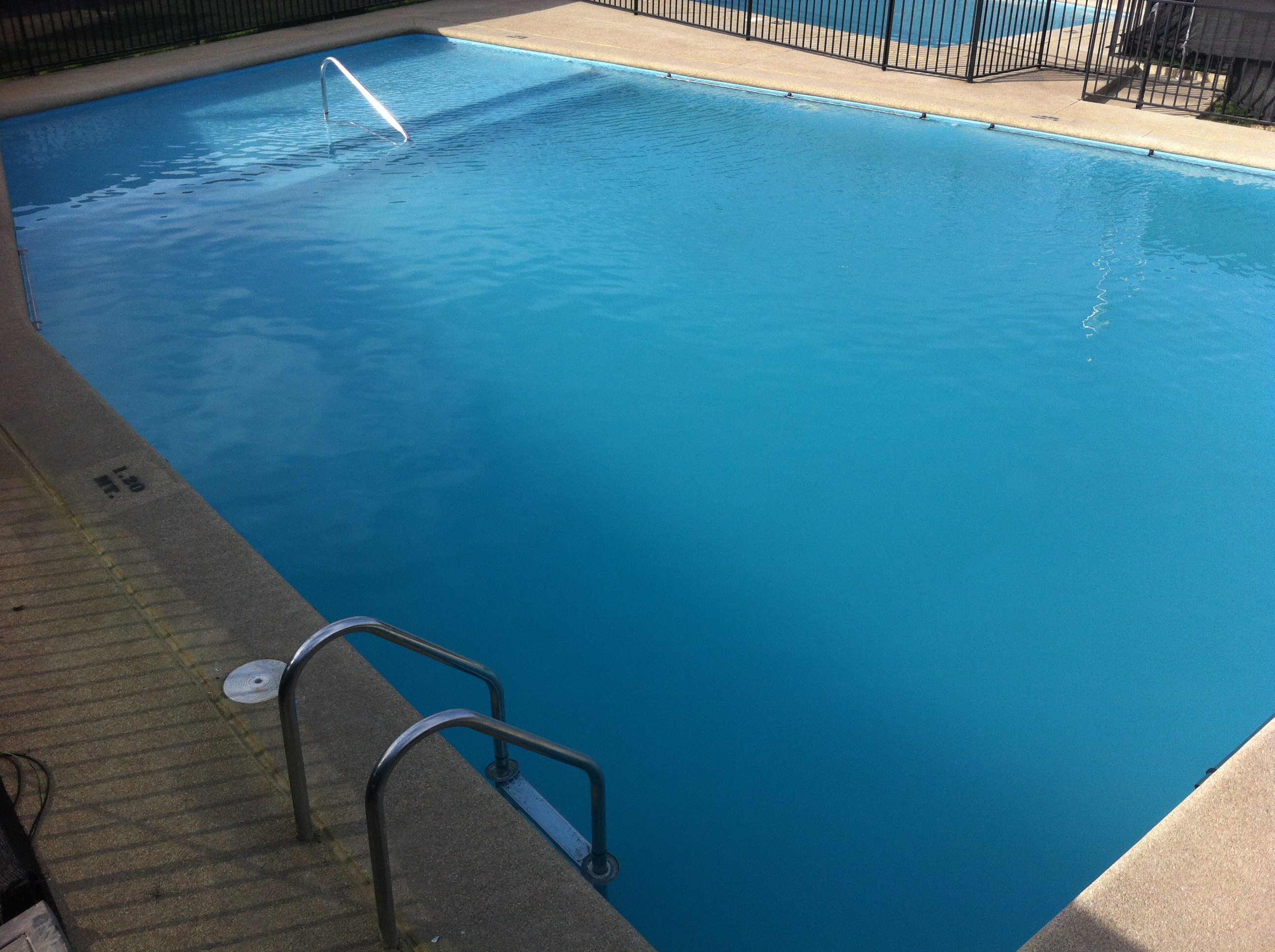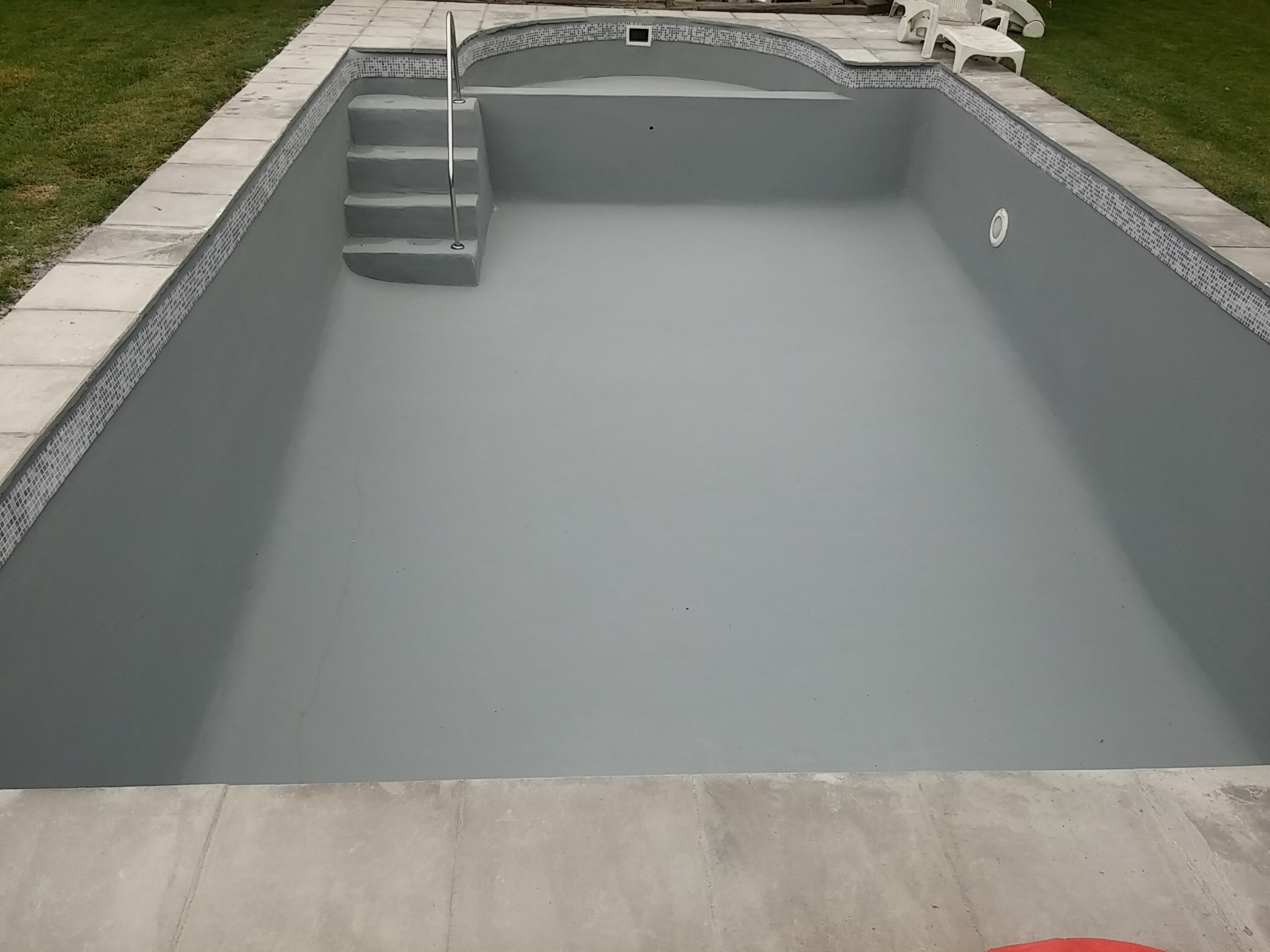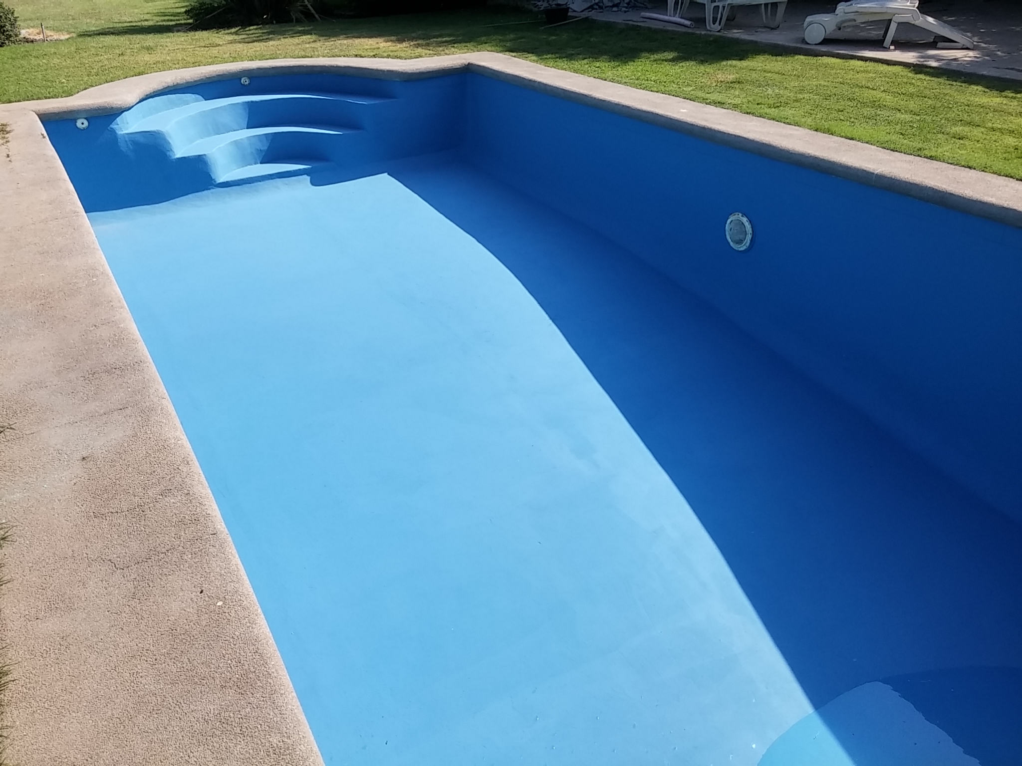 Reparación efectuada con membrana Fibra de Vidrio y pintura especial, lo que da una fina terminación, especial para piscinas de edicifios y condominios las que son de uso masivo.